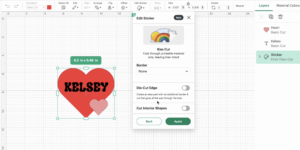 Cricut Design Space tutorial image demonstrating how to create a Print Then Cut sticker using the Edit Sticker tool. Shows how to enable Kiss Cut or Die-Cut edge options when turning a heart design into a custom sticker.