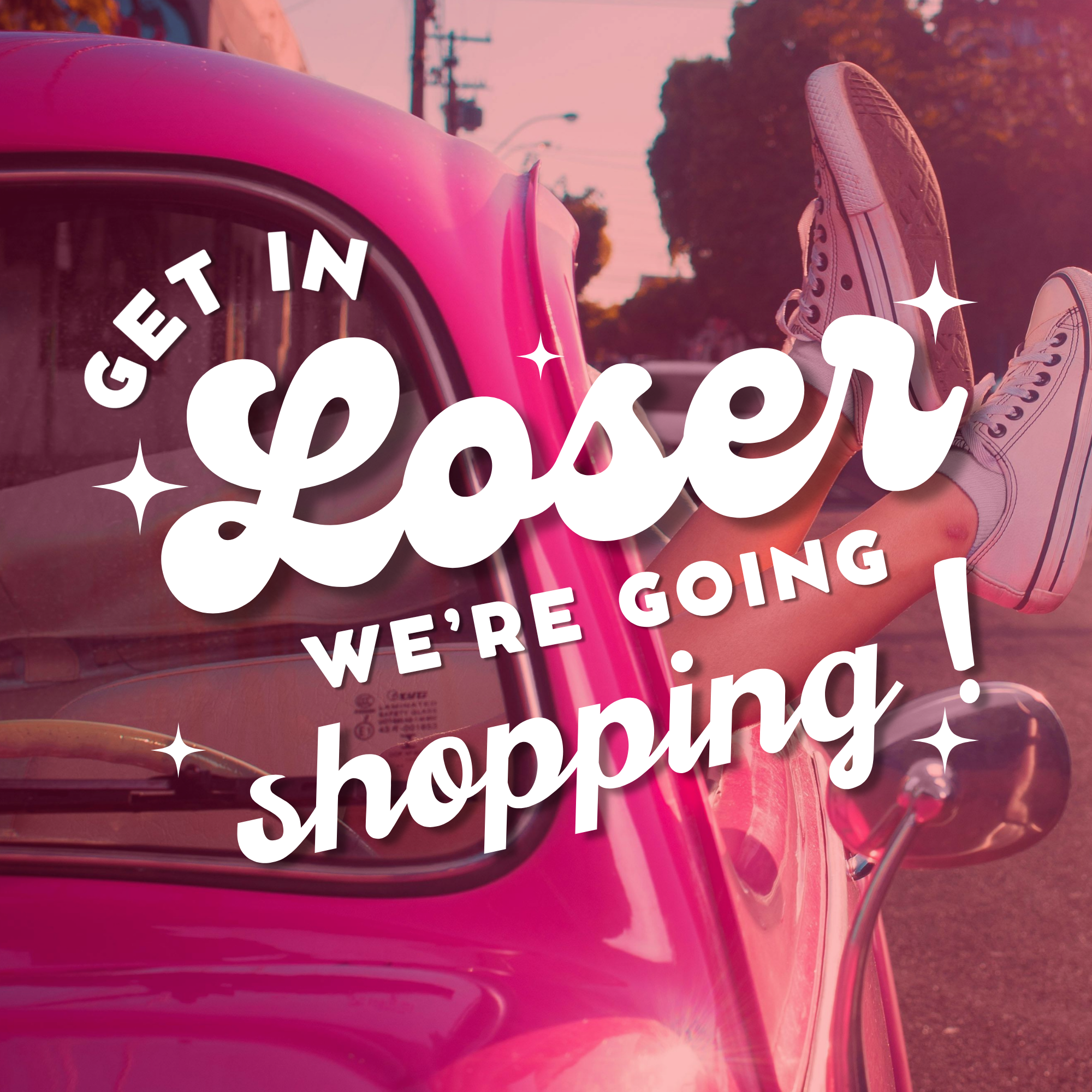 Get In Loser Shopping Car Decal SVG A fun, sassy graphic featuring bright lettering over a vintage pink car. The design has an upbeat, girly vibe and captures the energy of a playful, shopping-themed SVG.