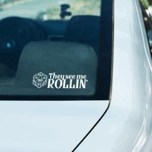 They See Me Rollin D20 Car Decal SVG A geeky, playful white vinyl decal featuring a Dungeons & Dragons dice alongside bold lettering. Ideal for gamers who want a fun decal on their vehicle.