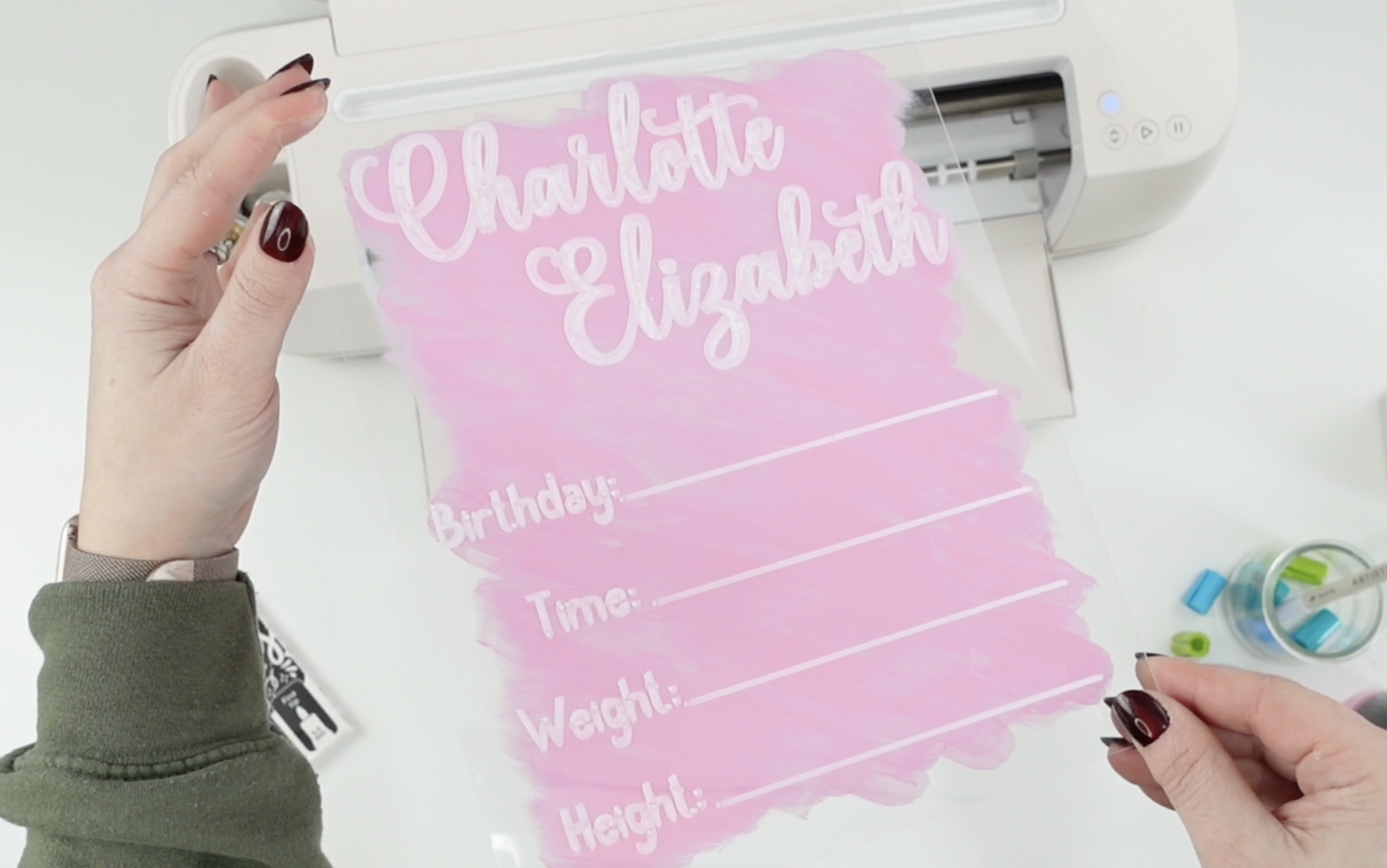 A completed acrylic sign featuring the name “Charlotte Elizabeth” written in white acrylic marker, with labeled lines for birthday, time, weight, and height. The back of the acrylic is painted pink to make the lettering stand out, creating a soft, handmade look perfect for baby announcements or wedding signage.