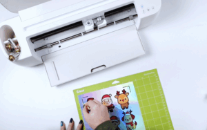 A crafter uses the white crayon trick on a holographic sticker sheet by shading over the registration mark to help the Cricut sensor read it accurately. This method reduces shine and improves Print Then Cut results when working with reflective holographic materials.
